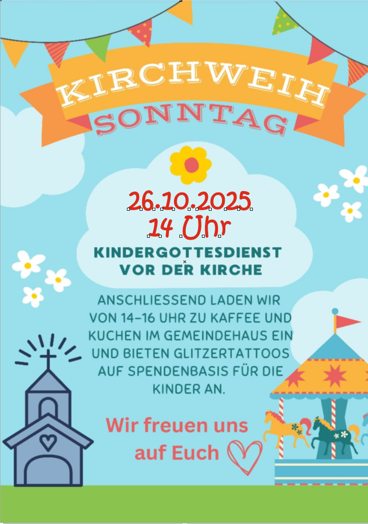 Herzlich Willkommen! Der Festgottesdienst mit Abendmahl und Posaunenchor beginnt um 9:00 Uhr. Ab 14:00 Uhr laden wir vor dem Gemeindehaus zu einem Kindergottesdienst ein. Zudem freuen wir uns, alle zu Kaffee und Kuchen im Gemeindehaus begrüßen zu dürfen.( Kuchen gibt es auch zum mitnehmen).