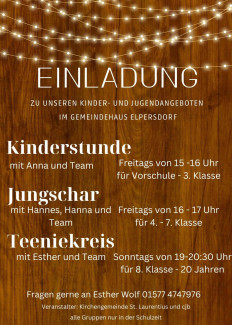 Wir treffen uns einmal wöchentlich im Gemeindehaus in Elpersdorf für eine Stunde mit Spielen und einer Geschichte aus der Bibel. Immer wieder gibt es auch besondere Aktionen, wie beispielsweise die Freizeit mit Übernachtung im Sommer.